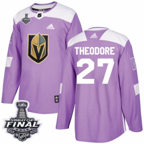 >Men's Adidas Vegas Golden Knights #27 Shea Theodore Authentic Purple Fights Cancer Practice 2018 Stanley Cup Final NHL Jersey