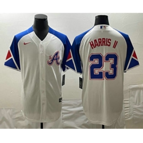 >Men's Atlanta Braves #23 Michael Harris II White 2023 City Connect Cool Base Stitched Jersey