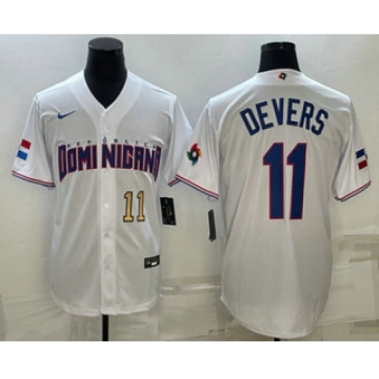 >Mens Dominican Republic Baseball #11 Rafael Devers Number 2023 White World Baseball Classic Stitched Jersey
