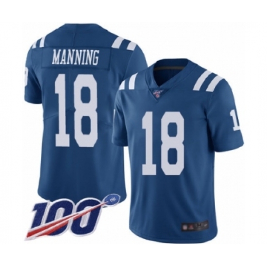 >Men's Indianapolis Colts #18 Peyton Manning Limited Royal Blue Rush Vapor Untouchable 100th Season Football Jersey