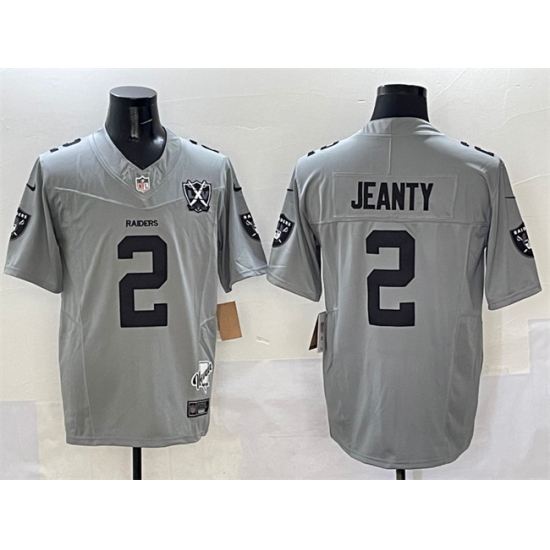 >Men's Las Vegas Raiders #2 Ashton Jeanty Gray 2025 Draft F.U.S.E. With Nevada Silver Stat And 65th Anniversary Football Stitched Jersey