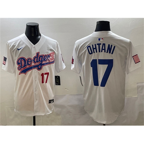 Men's Los Angeles Dodgers #17 Shohei Ohtani White With American Flag Limited Stitched Baseball Jersey