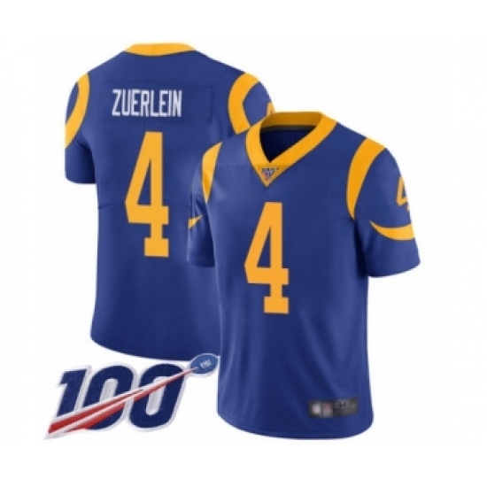 >Men's Los Angeles Rams #4 Greg Zuerlein Royal Blue Alternate Vapor Untouchable Limited Player 100th Season Football Jersey