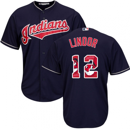 Home>MLB>Cleveland Indians>Francisco Lindor>Men's Majestic Cleveland Indians #12 Francisco Lindor Authentic Navy Blue Team Logo Fashion Cool Base MLB Jersey