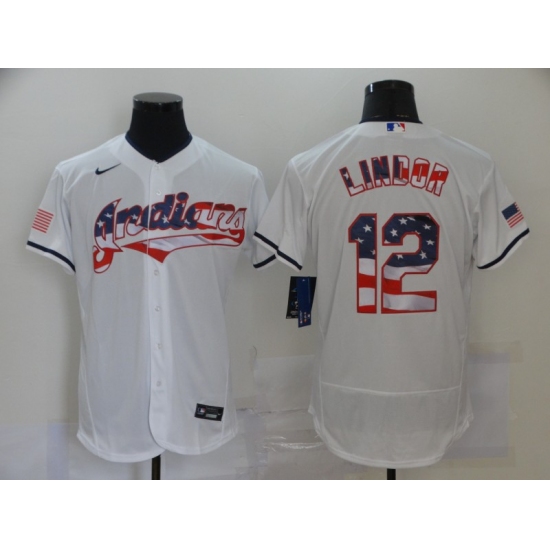 Men's Nike Cleveland Indians #12 Francisco Lindor White 2020 Stars & Stripes 4th of July Jersey