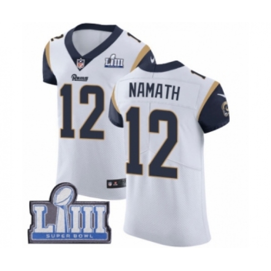 >Men's Nike Los Angeles Rams #12 Joe Namath White Vapor Untouchable Elite Player Super Bowl LIII Bound NFL Jersey