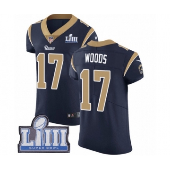 >Men's Nike Los Angeles Rams #17 Robert Woods Navy Blue Team Color Vapor Untouchable Elite Player Super Bowl LIII Bound NFL Jersey