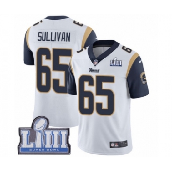 >Men's Nike Los Angeles Rams #65 John Sullivan White Vapor Untouchable Limited Player Super Bowl LIII Bound NFL Jersey