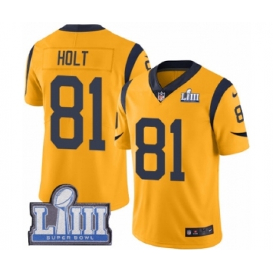 >Men's Nike Los Angeles Rams #81 Torry Holt Limited Gold Rush Vapor Untouchable Super Bowl LIII Bound NFL Jersey