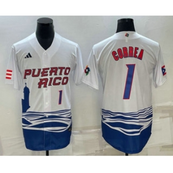 Mens Puerto Rico Baseball #1 Carlos Correa Number White 2023 World Baseball Classic Stitched Jersey