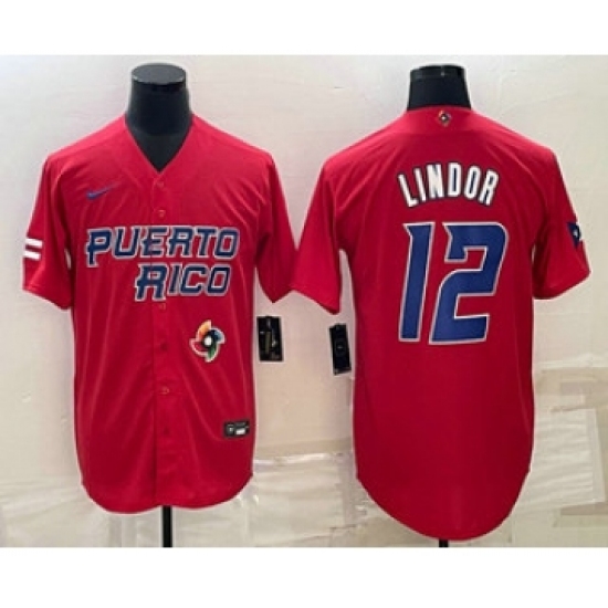 Men's Puerto Rico Baseball #12 Francisco Lindor 2023 Red World Baseball Classic Stitched Jersey