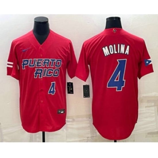 >Men's Puerto Rico Baseball #4 Yadier Molina Number 2023 Red World Baseball Classic Stitched Jersey