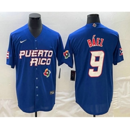 Men's Puerto Rico Baseball #9 Javier Baez 2023 Blue World Baseball Classic Stitched Jersey