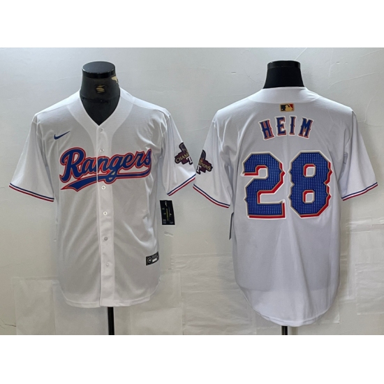 Men's Texas Rangers #28 Jonah Heim White 2023 World Series Flex Base Stitched Baseball Jersey