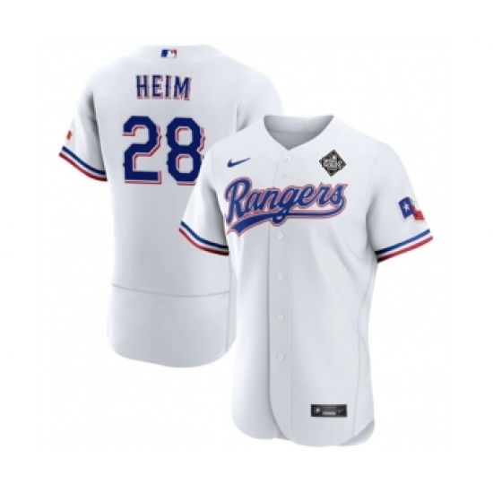 Men's Texas Rangers #28 Jonah Heim White 2023 World Series Flex Base Stitched Baseball Jersey
