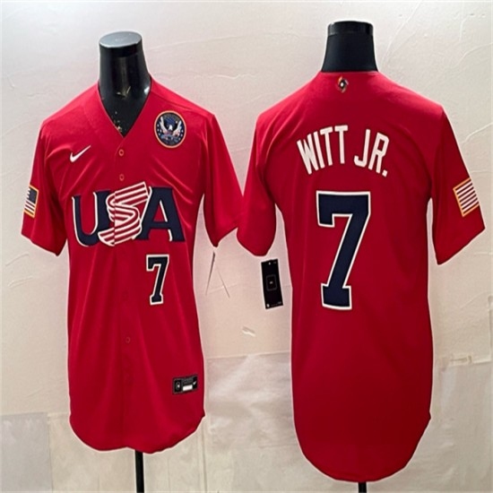 >Men's USA Baseball #7 Bobby Witt Jr. Red 2026 World Baseball Classic United States 250th Anniversary Stadium Stitched Jersey