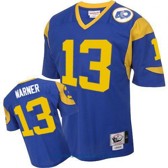 Feel like part of your favorite team by wearing this NFL® Mitchell and Ness Los Angeles Rams #13 Kurt Warner Authentic Blue Throwback NFL Jersey, made of thick, high-quality Pro-Brite fabric for a genuine gridiron look. The players number which 100% stitched is displayed in tackle twill on the chest, back and sleeves, along with the team name on the front. The players name which 100% stitched is displayed on a sewn-down nameplate at the back. 100% Pro-Brite nylon and 100% Pro-Brite polyester for body, 100% lycratalic spandex dazzle for Side Panels/Collar/Cuffs, NFL® Equipment patch sewn on the bottom of the front collar or fabric insert, NFL® Equipment jock tag with numeric sizing is applied to the lower left bottom of the jersey, Officially licensed