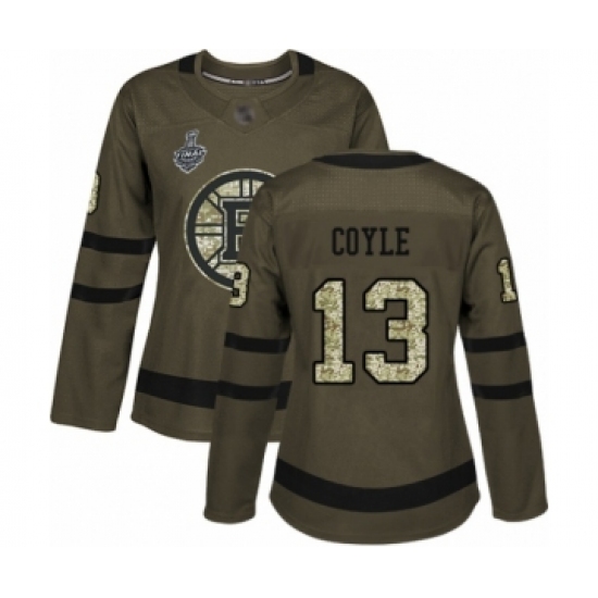 >Women's Boston Bruins #13 Charlie Coyle Authentic Green Salute to Service 2019 Stanley Cup Final Bound Hockey Jersey