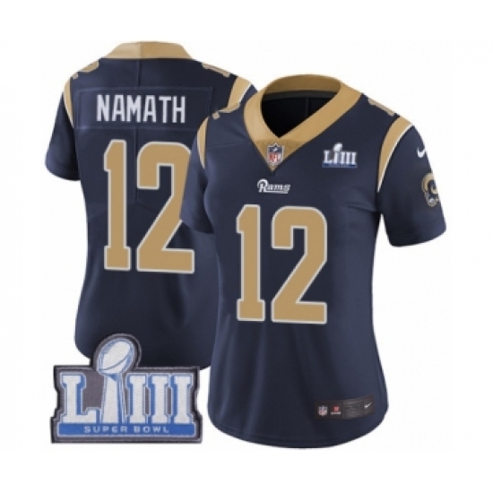 >Women's Nike Los Angeles Rams #12 Joe Namath Navy Blue Team Color Vapor Untouchable Limited Player Super Bowl LIII Bound NFL Jersey