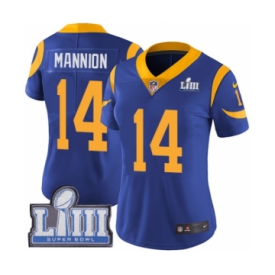 >Women's Nike Los Angeles Rams #14 Sean Mannion Royal Blue Alternate Vapor Untouchable Limited Player Super Bowl LIII Bound NFL Jersey