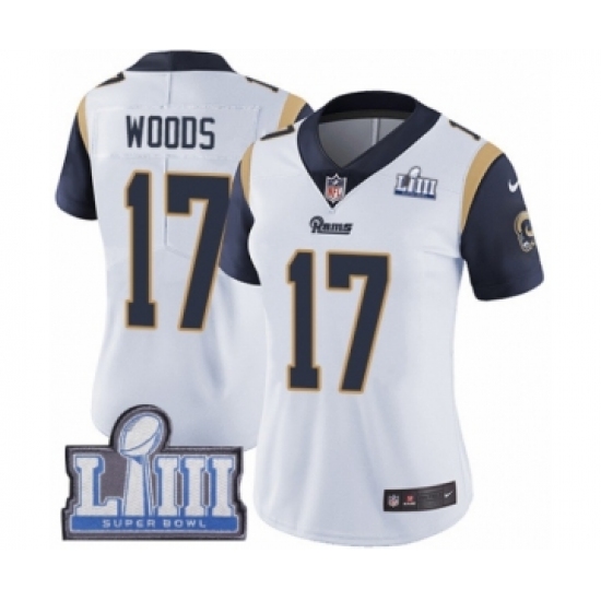 >Women's Nike Los Angeles Rams #17 Robert Woods White Vapor Untouchable Limited Player Super Bowl LIII Bound NFL Jersey