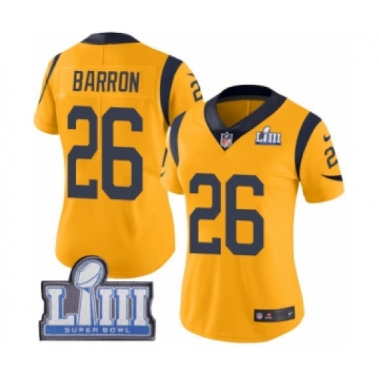 >Women's Nike Los Angeles Rams #26 Mark Barron Limited Gold Rush Vapor Untouchable Super Bowl LIII Bound NFL Jersey