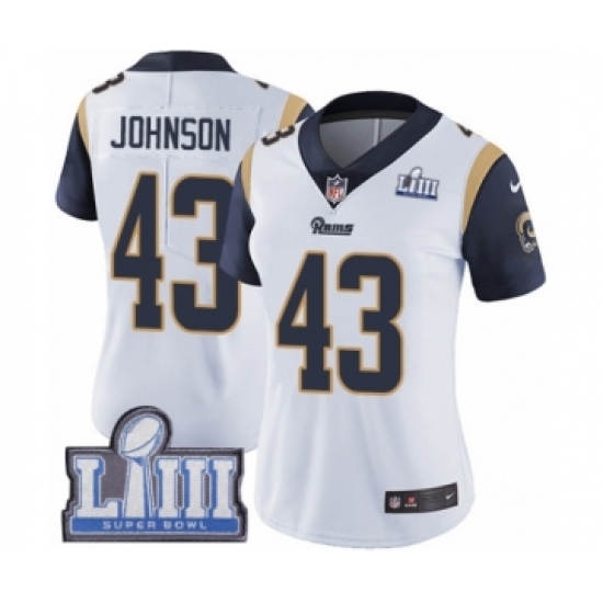 >Women's Nike Los Angeles Rams #43 John Johnson White Vapor Untouchable Limited Player Super Bowl LIII Bound NFL Jersey