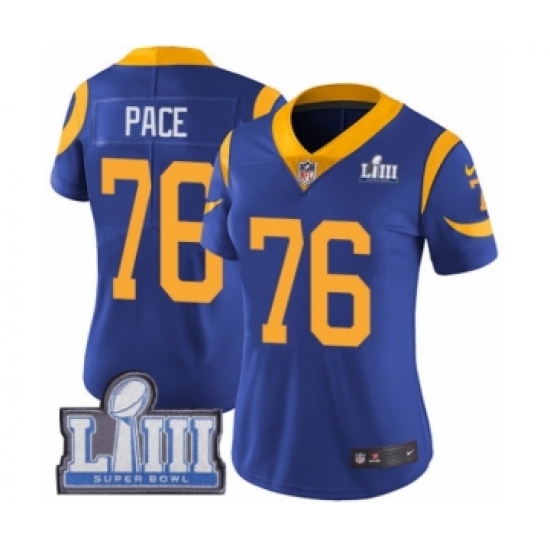>Women's Nike Los Angeles Rams #76 Orlando Pace Royal Blue Alternate Vapor Untouchable Limited Player Super Bowl LIII Bound NFL Jersey