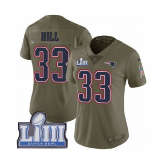 >Women's Nike New England Patriots #33 Jeremy Hill Limited Olive 2017 Salute to Service Super Bowl LIII Bound NFL Jersey