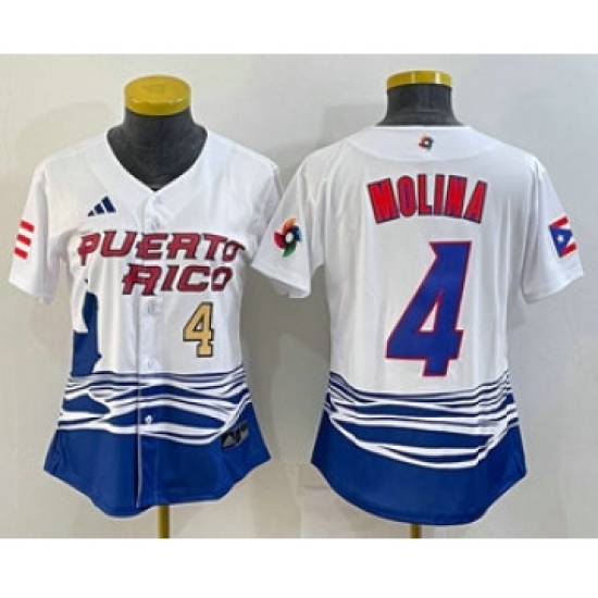 >Women's Puerto Rico Baseball #4 Yadier Molina Number 2023 Red World Classic Stitched Jersey