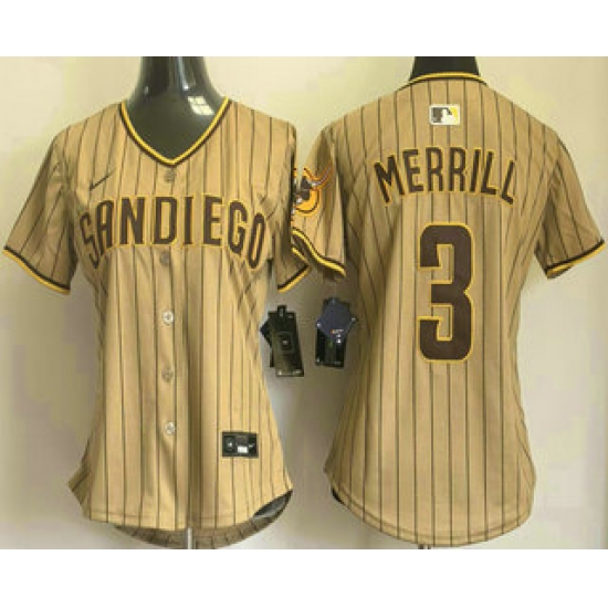>Women's San Diego Padres #3 Jackson Merrill Khaki Pinstripe Limited Stitched Jersey