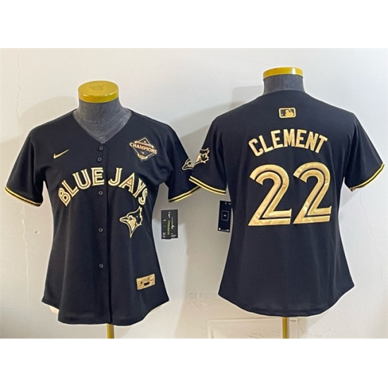 >Women's Toronto Blue Jays #22 Ernie Clement Black Gold 2025 American League Champions Limited Stitched Baseball Jersey(Run Small)