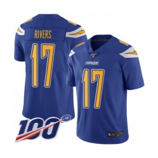 >Youth Nike Los Angeles Chargers #17 Philip Rivers Limited Electric Blue Rush Vapor Untouchable 100th Season NFL Jersey