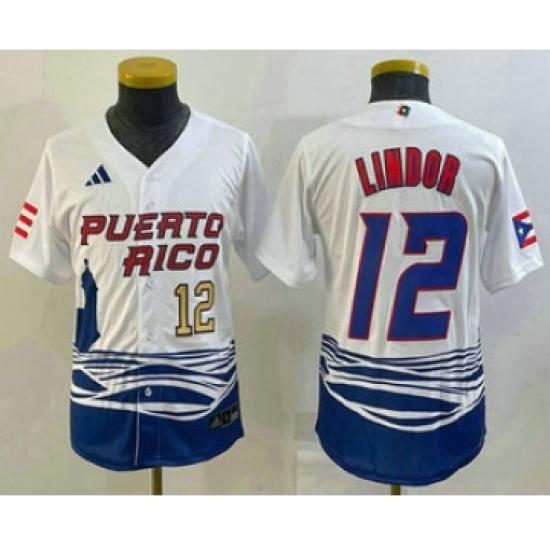 Youth Puerto Rico Baseball #12 Francisco Lindor Number 2023 White World Baseball Classic Stitched Jersey1