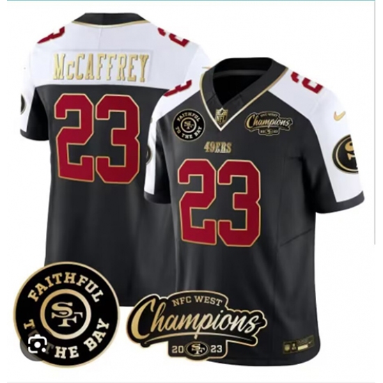 >Men San Francisco 49ers #23 Christian McCaffrey White Balck 2023 F U S E With 3 Star And Faithful To The Bay Stitched Football Jersey