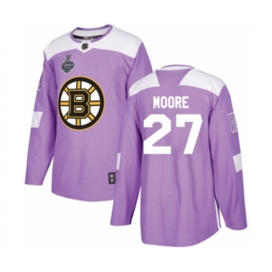 >Men's Boston Bruins #27 John Moore Authentic Purple Fights Cancer Practice 2019 Stanley Cup Final Bound Hockey Jersey