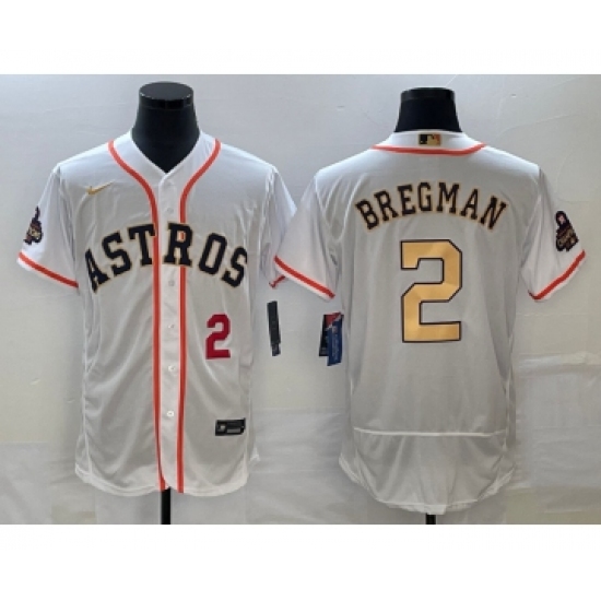 >Men's Houston Astros #2 Alex Bregman Number 2023 White Gold World Serise Champions Flex Base Stitched Jersey1
