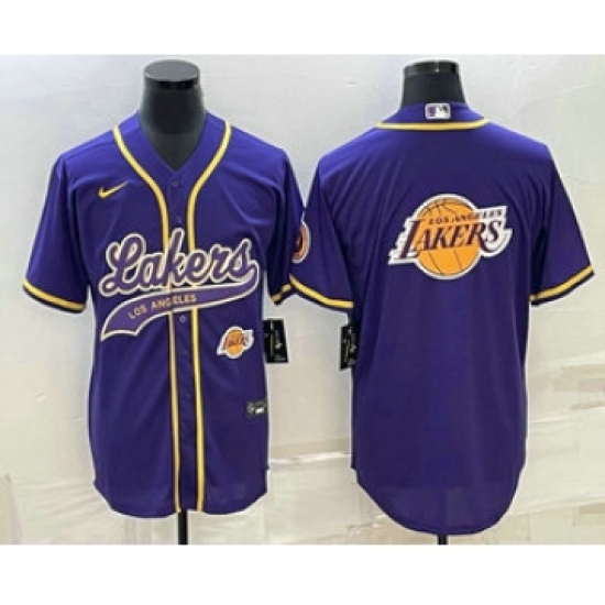 >Men's Los Angeles Lakers Purple Team Big Logo With Cool Base Stitched Baseball Jersey