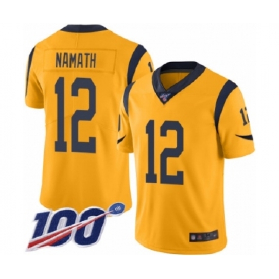 >Men's Los Angeles Rams #12 Joe Namath Limited Gold Rush Vapor Untouchable 100th Season Football Jersey