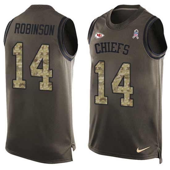 Home>NFL>Kansas City Chiefs>Demarcus Robinson>Men's Nike Kansas City Chiefs #14 Demarcus Robinson Limited Green Salute to Service Tank Top NFL Jersey