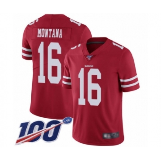 Men's San Francisco 49ers #16 Joe Montana Red Team Color Vapor Untouchable Limited Player 100th Season Football Jersey