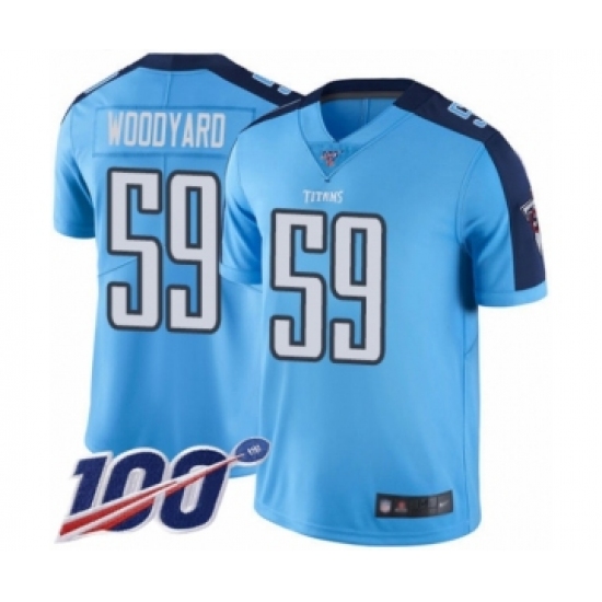 >Men's Tennessee Titans #59 Wesley Woodyard Limited Light Blue Rush Vapor Untouchable 100th Season Football Jersey