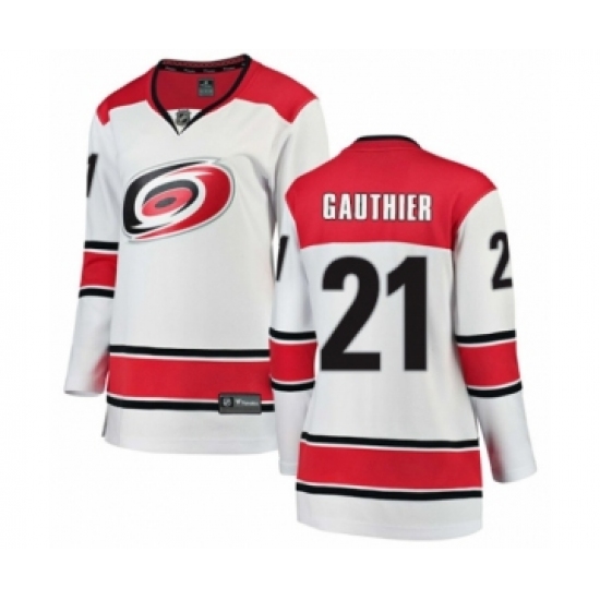 >Women's Carolina Hurricanes #21 Julien Gauthier Authentic White Away Fanatics Branded Breakaway NHL Jersey