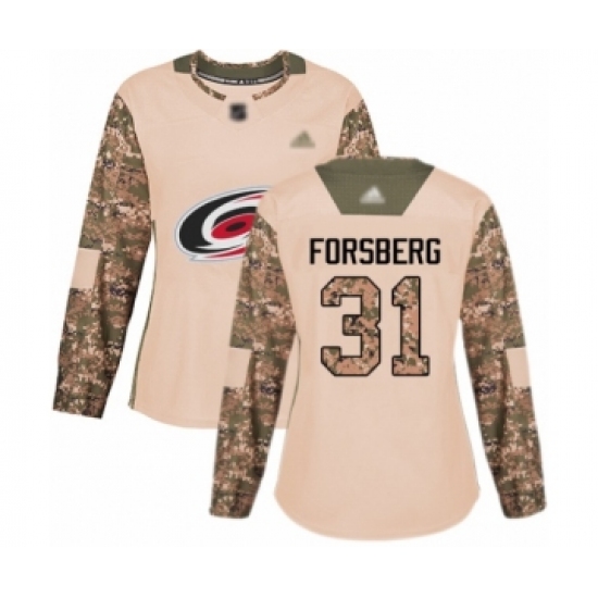 >Women's Carolina Hurricanes #31 Anton Forsberg Authentic Camo Veterans Day Practice Hockey Jersey