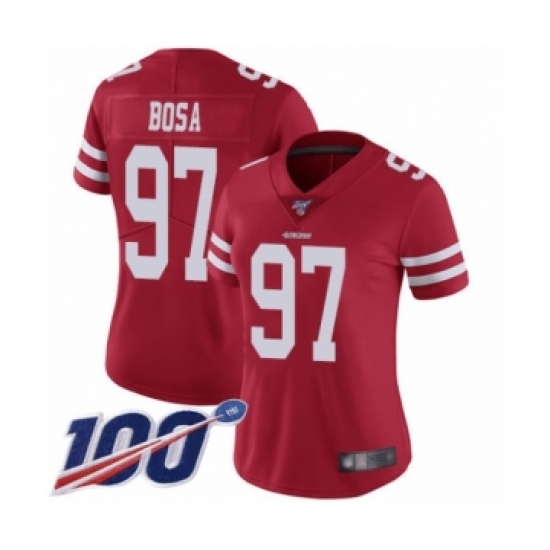 >Women's San Francisco 49ers #97 Nick Bosa Red Team Color Vapor Untouchable Limited Player 100th Season Football Jersey