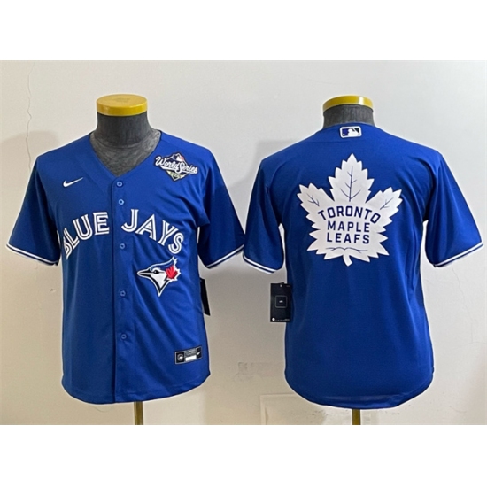>Youth Toronto Blue Jays & Leafs Royal 2025 World Series With White Leafs Logo Cool Base Stitched Baseball Jersey